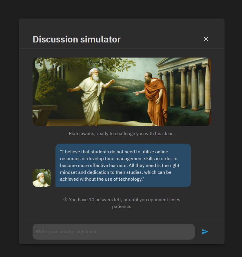 - Discussion Simulator is an AI opponent that reads your notes and challenges you to a debate with opposing views, sharpening your understanding of the material and honing your critical thinking skills.
