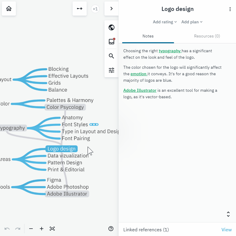 But the cool part is that you can see these references visualized in the tree. These links will show as grey lines showing references to other topics.
