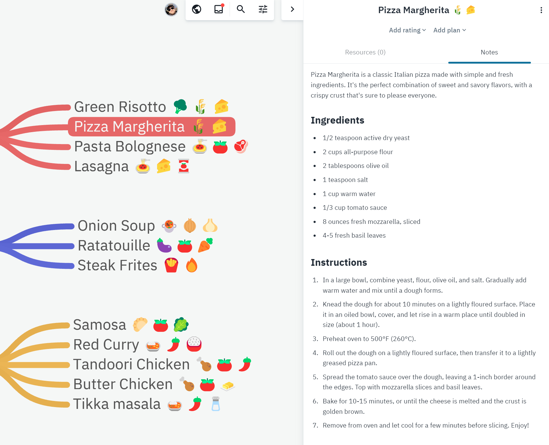 When you have the structure nailed down, you can start filling the mind map with notes and recipes, personally I prefer to add a short description of the dish, including the overall taste, and then maybe even add a image to the notes field to top it off. If there is something peculiar to keep in mind when cooking, adding a highlight or marker will make it easier to spot.