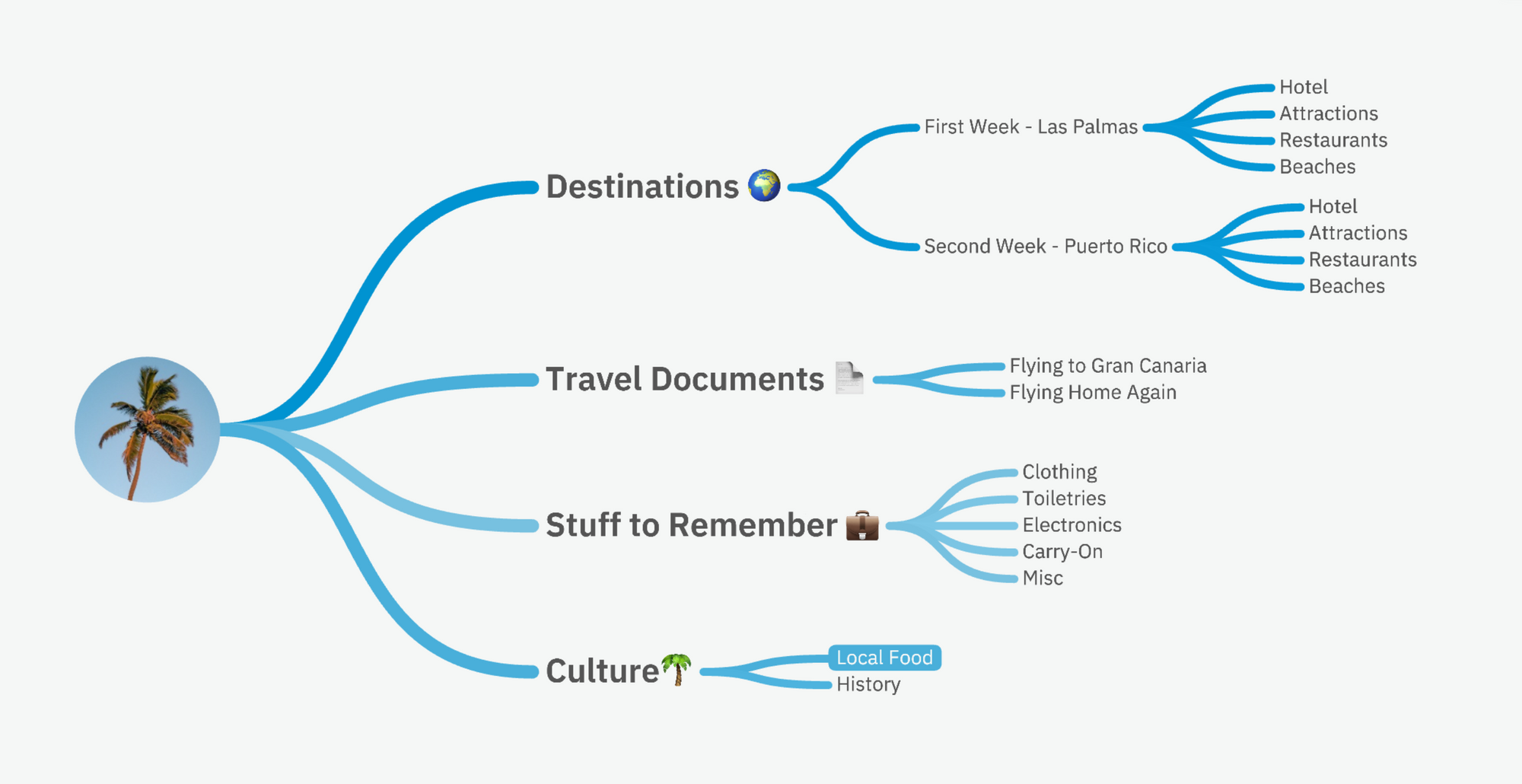 What categories you use will depend on what aspects of planning a trip are important to you. For example, if you're interested in local food, you might make a seperate "Food" category. Once you have your initial categories, you can add new branches and rearrange them as needed.