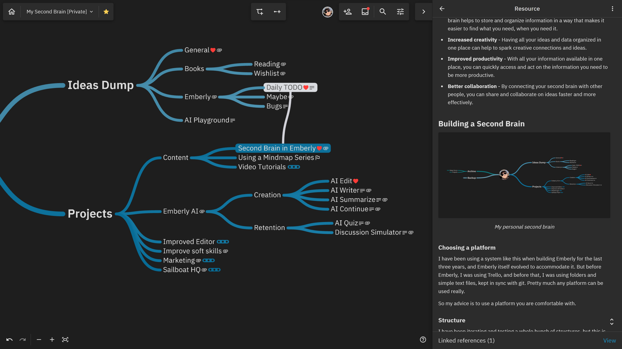 Building a powerful system for taking notes and organizing your thoughts doesn't have to be overwhelming - all you need to do is combine two fundamental units: Structure and Content. With Emberly, you can create a mind map that serves as the structure for your notes, and then add the content directly into the map.